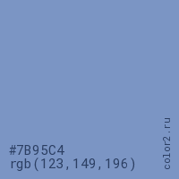 Цвет #7B95C4 в цветовой модели RGB обозначается тремя октетами (123, 149, 196) в десятичном формате и #7B95C4 в шестнадцатиричном (hex) формате, которые являются интенсивностью красного 123 (hex 7B), интенсивность зелёного 149 (hex 95) и интенсивность синего 196 (hex C4).