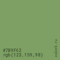 Цвет #7B9F62 в цветовой модели RGB обозначается тремя октетами (123, 159, 98) в десятичном формате и #7B9F62 в шестнадцатиричном (hex) формате, которые являются интенсивностью красного 123 (hex 7B), интенсивность зелёного 159 (hex 9F) и интенсивность синего 98 (hex 62).