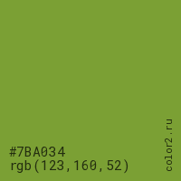 Цвет #7BA034 в цветовой модели RGB обозначается тремя октетами (123, 160, 52) в десятичном формате и #7BA034 в шестнадцатиричном (hex) формате, которые являются интенсивностью красного 123 (hex 7B), интенсивность зелёного 160 (hex A0) и интенсивность синего 52 (hex 34).