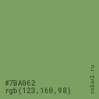 Цвет #7BA062 в цветовой модели RGB обозначается тремя октетами (123, 160, 98) в десятичном формате и #7BA062 в шестнадцатиричном (hex) формате, которые являются интенсивностью красного 123 (hex 7B), интенсивность зелёного 160 (hex A0) и интенсивность синего 98 (hex 62).