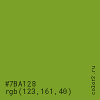Цвет #7BA128 в цветовой модели RGB обозначается тремя октетами (123, 161, 40) в десятичном формате и #7BA128 в шестнадцатиричном (hex) формате, которые являются интенсивностью красного 123 (hex 7B), интенсивность зелёного 161 (hex A1) и интенсивность синего 40 (hex 28).