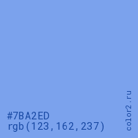 Цвет #7BA2ED в цветовой модели RGB обозначается тремя октетами (123, 162, 237) в десятичном формате и #7BA2ED в шестнадцатиричном (hex) формате, которые являются интенсивностью красного 123 (hex 7B), интенсивность зелёного 162 (hex A2) и интенсивность синего 237 (hex ED).