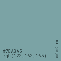 Цвет #7BA3A5 в цветовой модели RGB обозначается тремя октетами (123, 163, 165) в десятичном формате и #7BA3A5 в шестнадцатиричном (hex) формате, которые являются интенсивностью красного 123 (hex 7B), интенсивность зелёного 163 (hex A3) и интенсивность синего 165 (hex A5).