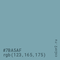 Цвет #7BA5AF в цветовой модели RGB обозначается тремя октетами (123, 165, 175) в десятичном формате и #7BA5AF в шестнадцатиричном (hex) формате, которые являются интенсивностью красного 123 (hex 7B), интенсивность зелёного 165 (hex A5) и интенсивность синего 175 (hex AF).