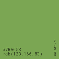 Цвет #7BA653 в цветовой модели RGB обозначается тремя октетами (123, 166, 83) в десятичном формате и #7BA653 в шестнадцатиричном (hex) формате, которые являются интенсивностью красного 123 (hex 7B), интенсивность зелёного 166 (hex A6) и интенсивность синего 83 (hex 53).
