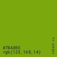 Цвет #7BA80E в цветовой модели RGB обозначается тремя октетами (123, 168, 14) в десятичном формате и #7BA80E в шестнадцатиричном (hex) формате, которые являются интенсивностью красного 123 (hex 7B), интенсивность зелёного 168 (hex A8) и интенсивность синего 14 (hex 0E).