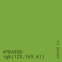 Цвет #7BA93D в цветовой модели RGB обозначается тремя октетами (123, 169, 61) в десятичном формате и #7BA93D в шестнадцатиричном (hex) формате, которые являются интенсивностью красного 123 (hex 7B), интенсивность зелёного 169 (hex A9) и интенсивность синего 61 (hex 3D).