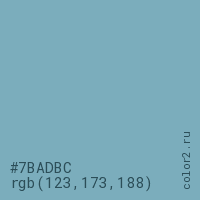 Цвет #7BADBC в цветовой модели RGB обозначается тремя октетами (123, 173, 188) в десятичном формате и #7BADBC в шестнадцатиричном (hex) формате, которые являются интенсивностью красного 123 (hex 7B), интенсивность зелёного 173 (hex AD) и интенсивность синего 188 (hex BC).