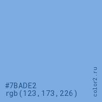 Цвет #7BADE2 в цветовой модели RGB обозначается тремя октетами (123, 173, 226) в десятичном формате и #7BADE2 в шестнадцатиричном (hex) формате, которые являются интенсивностью красного 123 (hex 7B), интенсивность зелёного 173 (hex AD) и интенсивность синего 226 (hex E2).