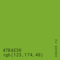 Цвет #7BAE30 в цветовой модели RGB обозначается тремя октетами (123, 174, 48) в десятичном формате и #7BAE30 в шестнадцатиричном (hex) формате, которые являются интенсивностью красного 123 (hex 7B), интенсивность зелёного 174 (hex AE) и интенсивность синего 48 (hex 30).