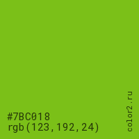 Цвет #7BC018 в цветовой модели RGB обозначается тремя октетами (123, 192, 24) в десятичном формате и #7BC018 в шестнадцатиричном (hex) формате, которые являются интенсивностью красного 123 (hex 7B), интенсивность зелёного 192 (hex C0) и интенсивность синего 24 (hex 18).