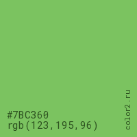 Цвет #7BC360 в цветовой модели RGB обозначается тремя октетами (123, 195, 96) в десятичном формате и #7BC360 в шестнадцатиричном (hex) формате, которые являются интенсивностью красного 123 (hex 7B), интенсивность зелёного 195 (hex C3) и интенсивность синего 96 (hex 60).