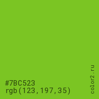 Цвет #7BC523 в цветовой модели RGB обозначается тремя октетами (123, 197, 35) в десятичном формате и #7BC523 в шестнадцатиричном (hex) формате, которые являются интенсивностью красного 123 (hex 7B), интенсивность зелёного 197 (hex C5) и интенсивность синего 35 (hex 23).