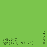 Цвет #7BC54C в цветовой модели RGB обозначается тремя октетами (123, 197, 76) в десятичном формате и #7BC54C в шестнадцатиричном (hex) формате, которые являются интенсивностью красного 123 (hex 7B), интенсивность зелёного 197 (hex C5) и интенсивность синего 76 (hex 4C).