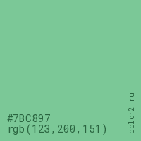 Цвет #7BC897 в цветовой модели RGB обозначается тремя октетами (123, 200, 151) в десятичном формате и #7BC897 в шестнадцатиричном (hex) формате, которые являются интенсивностью красного 123 (hex 7B), интенсивность зелёного 200 (hex C8) и интенсивность синего 151 (hex 97).