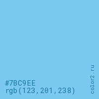 Цвет #7BC9EE в цветовой модели RGB обозначается тремя октетами (123, 201, 238) в десятичном формате и #7BC9EE в шестнадцатиричном (hex) формате, которые являются интенсивностью красного 123 (hex 7B), интенсивность зелёного 201 (hex C9) и интенсивность синего 238 (hex EE).