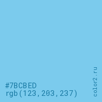 Цвет #7BCBED в цветовой модели RGB обозначается тремя октетами (123, 203, 237) в десятичном формате и #7BCBED в шестнадцатиричном (hex) формате, которые являются интенсивностью красного 123 (hex 7B), интенсивность зелёного 203 (hex CB) и интенсивность синего 237 (hex ED).