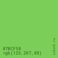 Цвет #7BCF58 в цветовой модели RGB обозначается тремя октетами (123, 207, 88) в десятичном формате и #7BCF58 в шестнадцатиричном (hex) формате, которые являются интенсивностью красного 123 (hex 7B), интенсивность зелёного 207 (hex CF) и интенсивность синего 88 (hex 58).