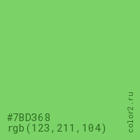 Цвет #7BD368 в цветовой модели RGB обозначается тремя октетами (123, 211, 104) в десятичном формате и #7BD368 в шестнадцатиричном (hex) формате, которые являются интенсивностью красного 123 (hex 7B), интенсивность зелёного 211 (hex D3) и интенсивность синего 104 (hex 68).