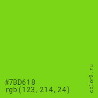 Цвет #7BD618 в цветовой модели RGB обозначается тремя октетами (123, 214, 24) в десятичном формате и #7BD618 в шестнадцатиричном (hex) формате, которые являются интенсивностью красного 123 (hex 7B), интенсивность зелёного 214 (hex D6) и интенсивность синего 24 (hex 18).