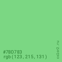 Цвет #7BD783 в цветовой модели RGB обозначается тремя октетами (123, 215, 131) в десятичном формате и #7BD783 в шестнадцатиричном (hex) формате, которые являются интенсивностью красного 123 (hex 7B), интенсивность зелёного 215 (hex D7) и интенсивность синего 131 (hex 83).