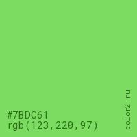 Цвет #7BDC61 в цветовой модели RGB обозначается тремя октетами (123, 220, 97) в десятичном формате и #7BDC61 в шестнадцатиричном (hex) формате, которые являются интенсивностью красного 123 (hex 7B), интенсивность зелёного 220 (hex DC) и интенсивность синего 97 (hex 61).
