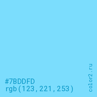 Цвет #7BDDFD в цветовой модели RGB обозначается тремя октетами (123, 221, 253) в десятичном формате и #7BDDFD в шестнадцатиричном (hex) формате, которые являются интенсивностью красного 123 (hex 7B), интенсивность зелёного 221 (hex DD) и интенсивность синего 253 (hex FD).