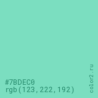 Цвет #7BDEC0 в цветовой модели RGB обозначается тремя октетами (123, 222, 192) в десятичном формате и #7BDEC0 в шестнадцатиричном (hex) формате, которые являются интенсивностью красного 123 (hex 7B), интенсивность зелёного 222 (hex DE) и интенсивность синего 192 (hex C0).