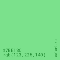 Цвет #7BE18C в цветовой модели RGB обозначается тремя октетами (123, 225, 140) в десятичном формате и #7BE18C в шестнадцатиричном (hex) формате, которые являются интенсивностью красного 123 (hex 7B), интенсивность зелёного 225 (hex E1) и интенсивность синего 140 (hex 8C).