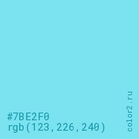 Цвет #7BE2F0 в цветовой модели RGB обозначается тремя октетами (123, 226, 240) в десятичном формате и #7BE2F0 в шестнадцатиричном (hex) формате, которые являются интенсивностью красного 123 (hex 7B), интенсивность зелёного 226 (hex E2) и интенсивность синего 240 (hex F0).