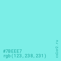 Цвет #7BEEE7 в цветовой модели RGB обозначается тремя октетами (123, 238, 231) в десятичном формате и #7BEEE7 в шестнадцатиричном (hex) формате, которые являются интенсивностью красного 123 (hex 7B), интенсивность зелёного 238 (hex EE) и интенсивность синего 231 (hex E7).