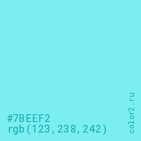 Цвет #7BEEF2 в цветовой модели RGB обозначается тремя октетами (123, 238, 242) в десятичном формате и #7BEEF2 в шестнадцатиричном (hex) формате, которые являются интенсивностью красного 123 (hex 7B), интенсивность зелёного 238 (hex EE) и интенсивность синего 242 (hex F2).
