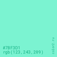 Цвет #7BF3D1 в цветовой модели RGB обозначается тремя октетами (123, 243, 209) в десятичном формате и #7BF3D1 в шестнадцатиричном (hex) формате, которые являются интенсивностью красного 123 (hex 7B), интенсивность зелёного 243 (hex F3) и интенсивность синего 209 (hex D1).