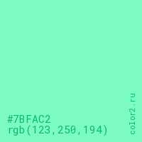 Цвет #7BFAC2 в цветовой модели RGB обозначается тремя октетами (123, 250, 194) в десятичном формате и #7BFAC2 в шестнадцатиричном (hex) формате, которые являются интенсивностью красного 123 (hex 7B), интенсивность зелёного 250 (hex FA) и интенсивность синего 194 (hex C2).