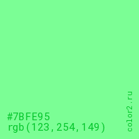 Цвет #7BFE95 в цветовой модели RGB обозначается тремя октетами (123, 254, 149) в десятичном формате и #7BFE95 в шестнадцатиричном (hex) формате, которые являются интенсивностью красного 123 (hex 7B), интенсивность зелёного 254 (hex FE) и интенсивность синего 149 (hex 95).
