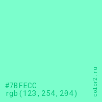 Цвет #7BFECC в цветовой модели RGB обозначается тремя октетами (123, 254, 204) в десятичном формате и #7BFECC в шестнадцатиричном (hex) формате, которые являются интенсивностью красного 123 (hex 7B), интенсивность зелёного 254 (hex FE) и интенсивность синего 204 (hex CC).