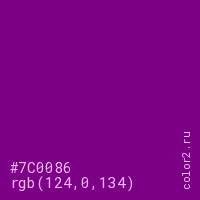Цвет #7C0086 в цветовой модели RGB обозначается тремя октетами (124, 0, 134) в десятичном формате и #7C0086 в шестнадцатиричном (hex) формате, которые являются интенсивностью красного 124 (hex 7C), интенсивность зелёного 0 (hex 00) и интенсивность синего 134 (hex 86).