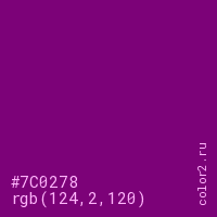 Цвет #7C0278 в цветовой модели RGB обозначается тремя октетами (124, 2, 120) в десятичном формате и #7C0278 в шестнадцатиричном (hex) формате, которые являются интенсивностью красного 124 (hex 7C), интенсивность зелёного 2 (hex 02) и интенсивность синего 120 (hex 78).