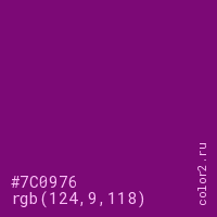 Цвет #7C0976 в цветовой модели RGB обозначается тремя октетами (124, 9, 118) в десятичном формате и #7C0976 в шестнадцатиричном (hex) формате, которые являются интенсивностью красного 124 (hex 7C), интенсивность зелёного 9 (hex 09) и интенсивность синего 118 (hex 76).