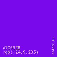 Цвет #7C09EB в цветовой модели RGB обозначается тремя октетами (124, 9, 235) в десятичном формате и #7C09EB в шестнадцатиричном (hex) формате, которые являются интенсивностью красного 124 (hex 7C), интенсивность зелёного 9 (hex 09) и интенсивность синего 235 (hex EB).