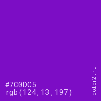 Цвет #7C0DC5 в цветовой модели RGB обозначается тремя октетами (124, 13, 197) в десятичном формате и #7C0DC5 в шестнадцатиричном (hex) формате, которые являются интенсивностью красного 124 (hex 7C), интенсивность зелёного 13 (hex 0D) и интенсивность синего 197 (hex C5).