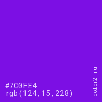 Цвет #7C0FE4 в цветовой модели RGB обозначается тремя октетами (124, 15, 228) в десятичном формате и #7C0FE4 в шестнадцатиричном (hex) формате, которые являются интенсивностью красного 124 (hex 7C), интенсивность зелёного 15 (hex 0F) и интенсивность синего 228 (hex E4).