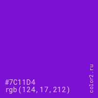 Цвет #7C11D4 в цветовой модели RGB обозначается тремя октетами (124, 17, 212) в десятичном формате и #7C11D4 в шестнадцатиричном (hex) формате, которые являются интенсивностью красного 124 (hex 7C), интенсивность зелёного 17 (hex 11) и интенсивность синего 212 (hex D4).