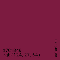 Цвет #7C1B40 в цветовой модели RGB обозначается тремя октетами (124, 27, 64) в десятичном формате и #7C1B40 в шестнадцатиричном (hex) формате, которые являются интенсивностью красного 124 (hex 7C), интенсивность зелёного 27 (hex 1B) и интенсивность синего 64 (hex 40).