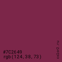Цвет #7C2649 в цветовой модели RGB обозначается тремя октетами (124, 38, 73) в десятичном формате и #7C2649 в шестнадцатиричном (hex) формате, которые являются интенсивностью красного 124 (hex 7C), интенсивность зелёного 38 (hex 26) и интенсивность синего 73 (hex 49).