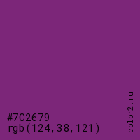 Цвет #7C2679 в цветовой модели RGB обозначается тремя октетами (124, 38, 121) в десятичном формате и #7C2679 в шестнадцатиричном (hex) формате, которые являются интенсивностью красного 124 (hex 7C), интенсивность зелёного 38 (hex 26) и интенсивность синего 121 (hex 79).