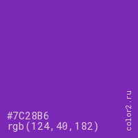 Цвет #7C28B6 в цветовой модели RGB обозначается тремя октетами (124, 40, 182) в десятичном формате и #7C28B6 в шестнадцатиричном (hex) формате, которые являются интенсивностью красного 124 (hex 7C), интенсивность зелёного 40 (hex 28) и интенсивность синего 182 (hex B6).