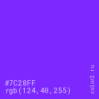Цвет #7C28FF в цветовой модели RGB обозначается тремя октетами (124, 40, 255) в десятичном формате и #7C28FF в шестнадцатиричном (hex) формате, которые являются интенсивностью красного 124 (hex 7C), интенсивность зелёного 40 (hex 28) и интенсивность синего 255 (hex FF).