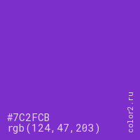 Цвет #7C2FCB в цветовой модели RGB обозначается тремя октетами (124, 47, 203) в десятичном формате и #7C2FCB в шестнадцатиричном (hex) формате, которые являются интенсивностью красного 124 (hex 7C), интенсивность зелёного 47 (hex 2F) и интенсивность синего 203 (hex CB).