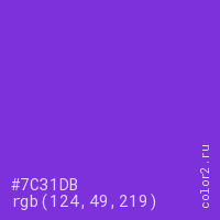 Цвет #7C31DB в цветовой модели RGB обозначается тремя октетами (124, 49, 219) в десятичном формате и #7C31DB в шестнадцатиричном (hex) формате, которые являются интенсивностью красного 124 (hex 7C), интенсивность зелёного 49 (hex 31) и интенсивность синего 219 (hex DB).